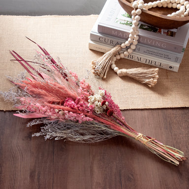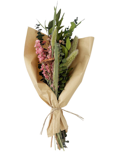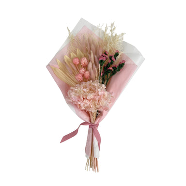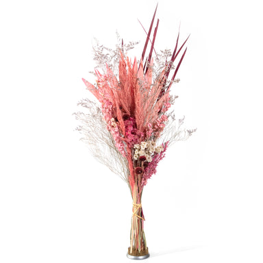 De La Terre floral bouquet with natural stems, preserved hydrangea flowers, Bunny Tails, Palm Frond and assorted Pink Dried flowers. This is the pe...