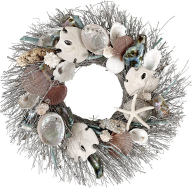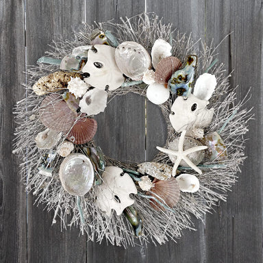 We handcrafted this 20" seashell wreath in our California studio using a variety of natural seashells in white & natural tones + 3 gorgeous aba...