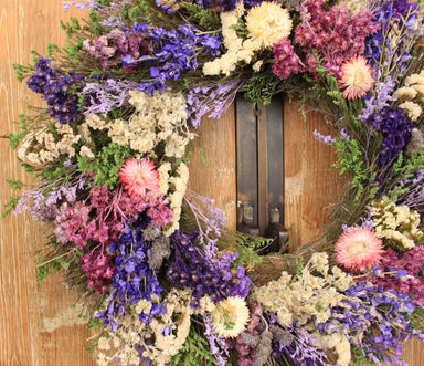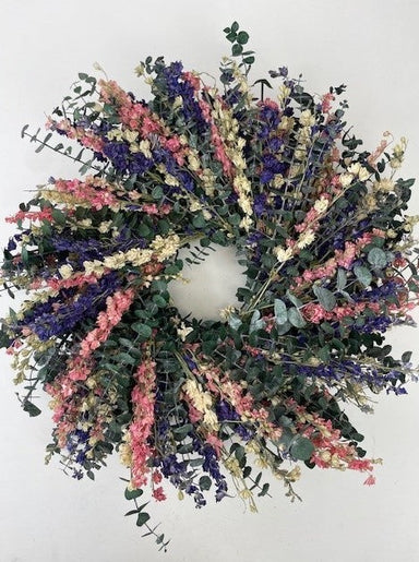 Each wreath is handcrafted at our studio in California using gorgeous dried purple, pink and white larkspur and preserved baby eucalyptus for a lon...