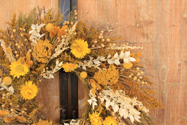 Using a mix of yellow grains and florals our team handcrafted this wreath to bring a naturally beautiful and sunny presence to your home's entrance...