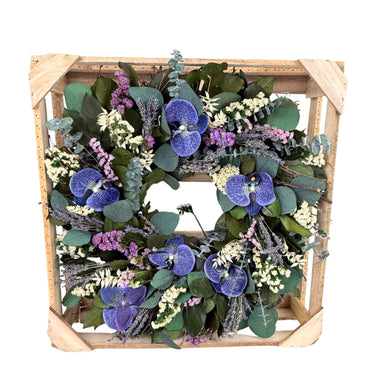 Handcrafted in the USA decorative floral wreath with Blue Orchids, Natural French lavender Stems, preserved eucalyptus and dried florals. Wreath sh...