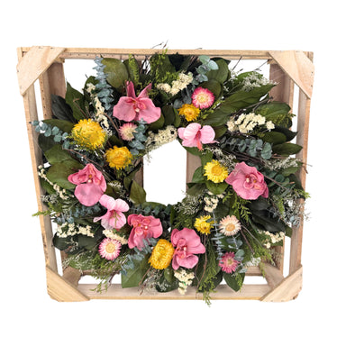 Handcrafted in the USA decorative floral wreath with Pink Orchids, Preserved Silver Dollar and Baby eucalyptus stems with dried Yellow and Pink str...