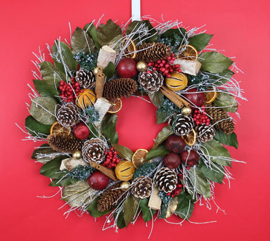 A twist on holiday wreaths, we've handcrafted this wreath using dried Pomegranates, Oranges, Cinnamon surrounded by natural and frosted pinecones o...